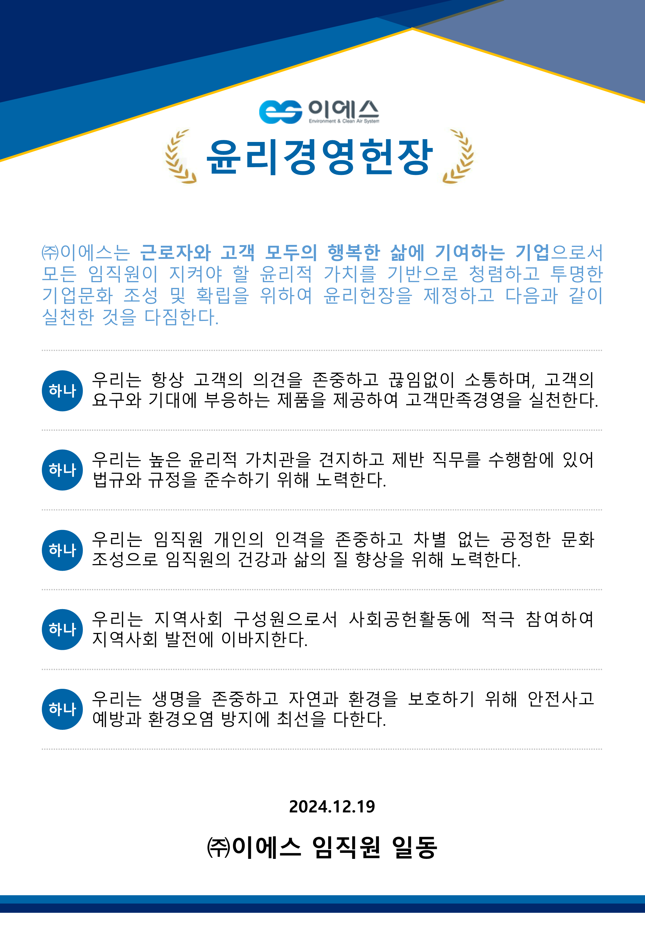 (주) 이에스는 공기조화 시스템의 선두주자로서 ESG(환경·사회·지배구조) 경영을 실천하고 있습니다. 지속 가능한 발전을 위해 환경 보호와 사회적 책임을 강화하며, 투명한 경영을 추구하고 있습니다. 앞으로도 더욱 강화된 ESG 전략을 통해 친환경 기술 개발과 사회적 가치를 창출하는 데 주력할 계획입니다.